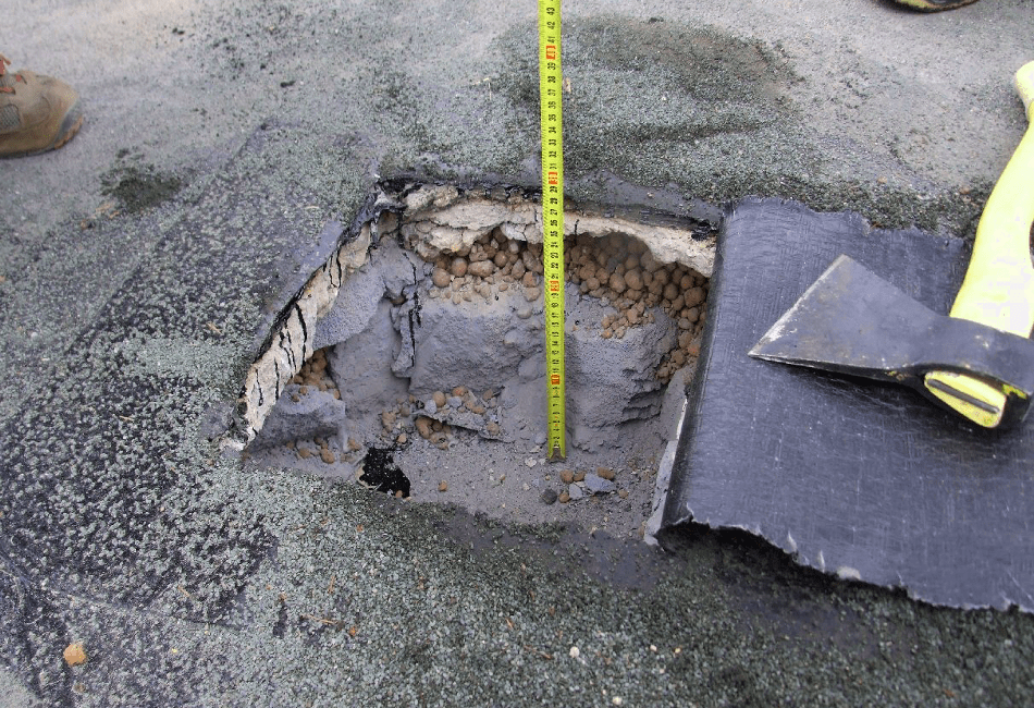 Затем, в соответствии с ГОСТ 2678-94, составляется субакт испытания кровли с занесением в него обнаруженных недостатков. Измеряется при помощи штыря из прочной стали толщина изоляционного слоя, на который нанесены разделительные обозначения.