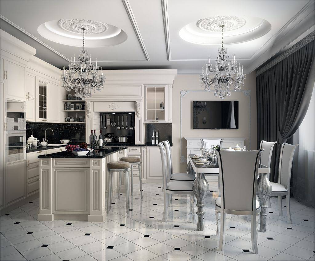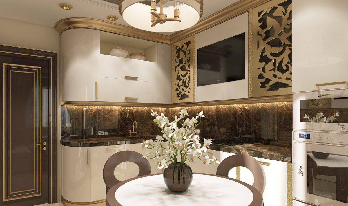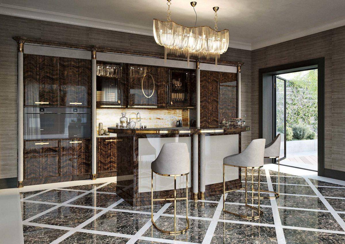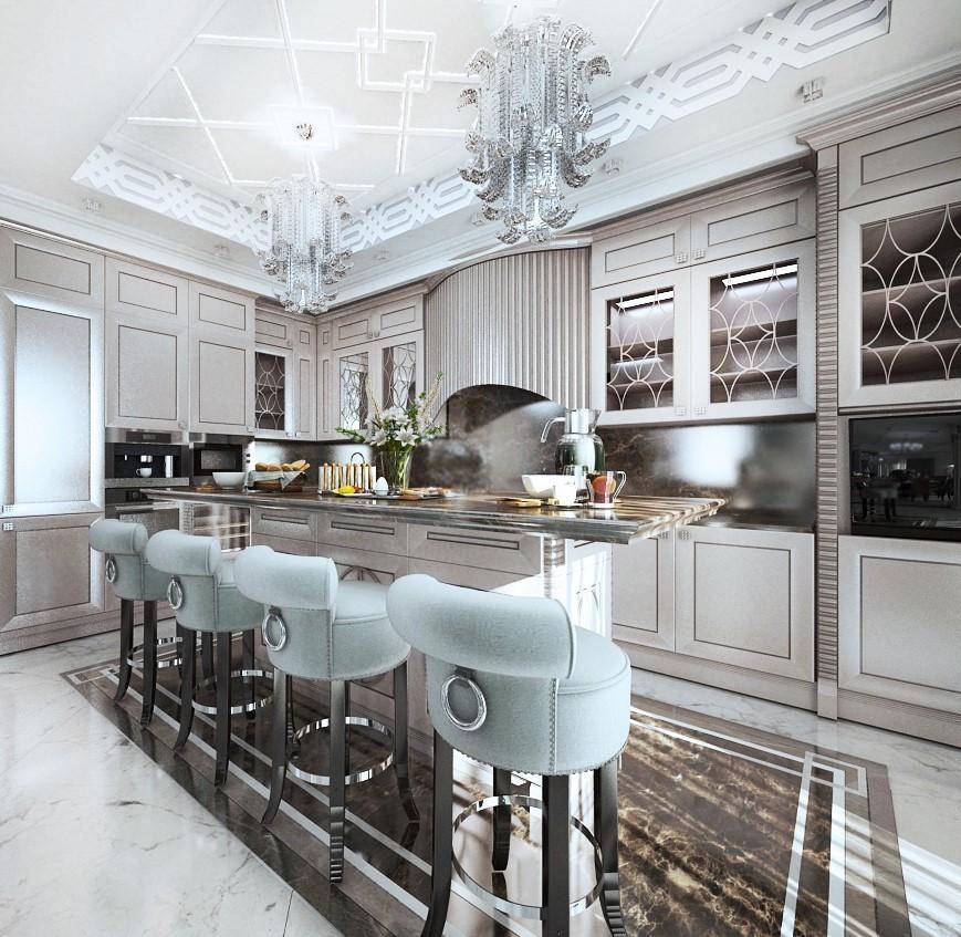 Столешница и рабочая поверхность часто изготавливаются из светлого или черного мрамора. Мебель в обеденной зоне должна быть высокая, для сидения часто используются барные стулья.