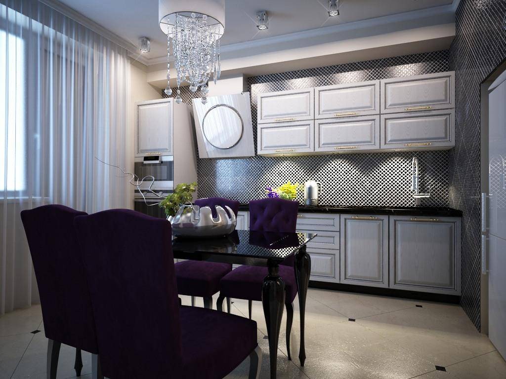 - Мебель выбирается преимущественно из стали и пластика с обшивкой из кожи. Для оформления кухни используют лакированную поверхность для гарнитура.