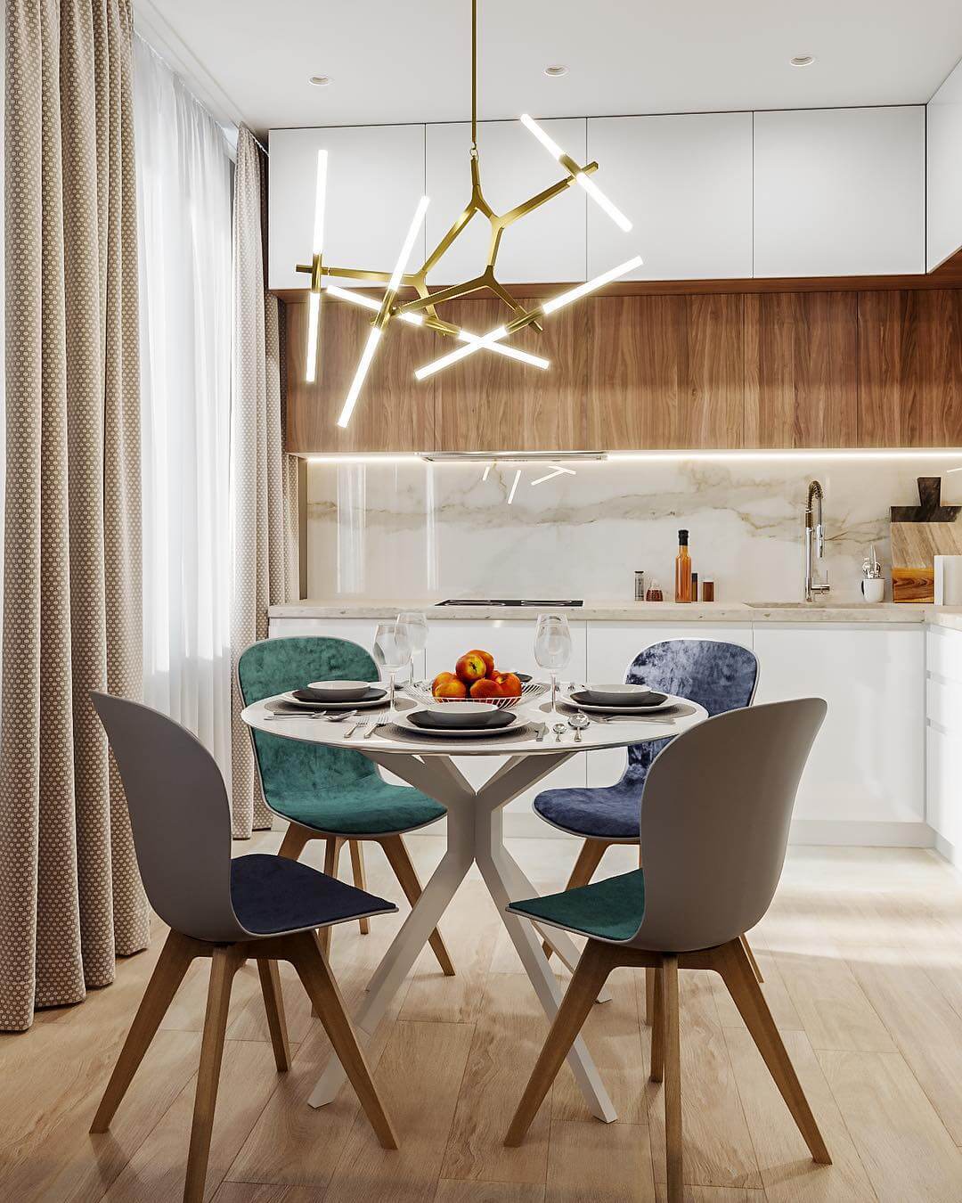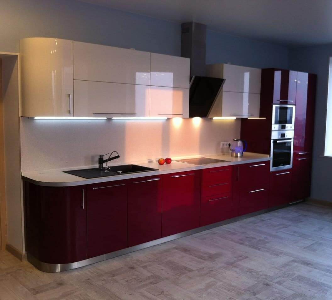 Сегодня на пике своей популярности находятся кухни, где яркие тона смело располагаются на белом фоне. Такая кухня станет гармоничной, уютной, стильной, наполненной атмосферой свежести и чистоты. Подобный интерьер не будет давить, всегда станет причиной хорошего настроения.