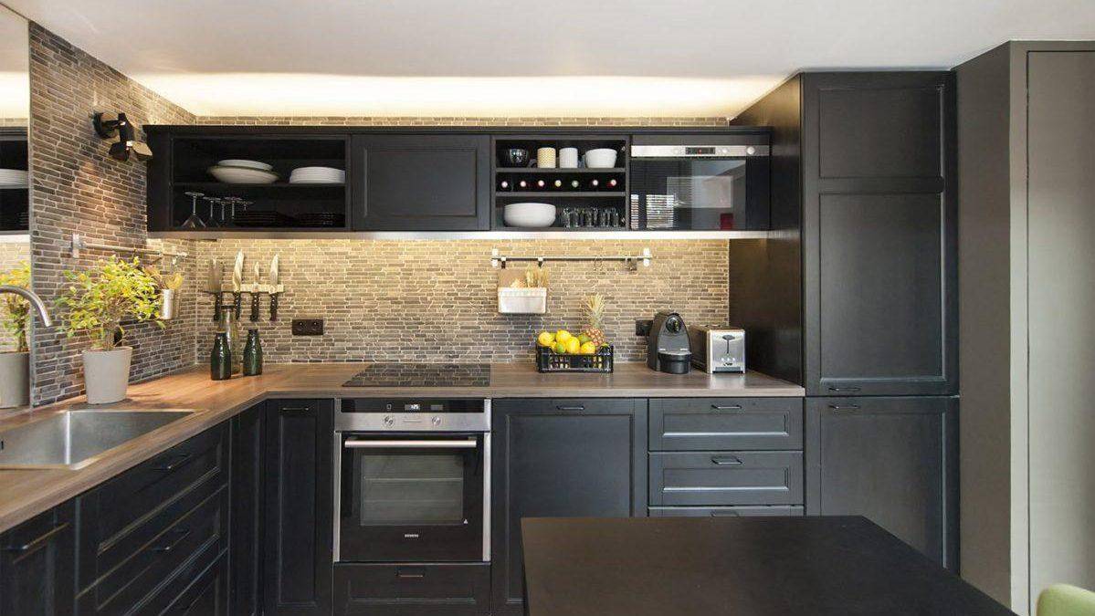 Тёмными могут быть как кухонный гарнитур, так и отделка стен и пола. Но совмещать эти опции (тёмная мебель + полностью тёмная отделка) не рекомендуется даже в просторных помещениях — есть риск превратить кухню в подобие склепа, в котором будет неуютно находиться.