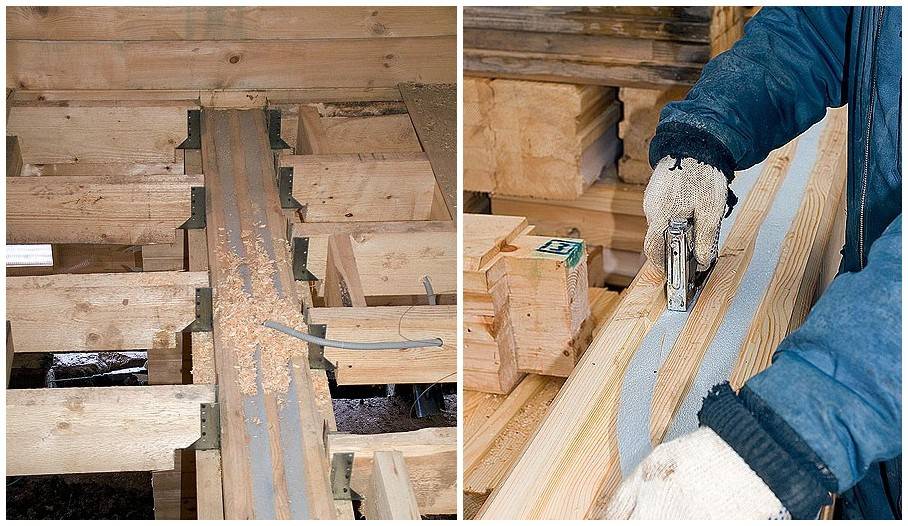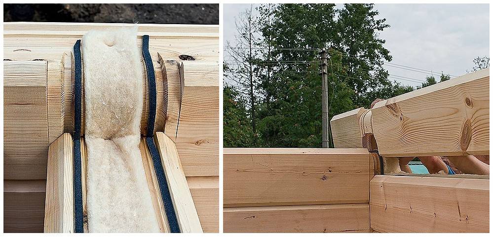 Необходимо заправлять вышеперечисленный материал между венцами таким образом, что он для профилированного клееного материала был спрятан между шипом и пазом, а для квадратного свисал по двум сторонам. Следует отметить, что если вы не произведете данную операцию изначально, то в таком случае вам придется неудобно заталкивать данный материал в щели.