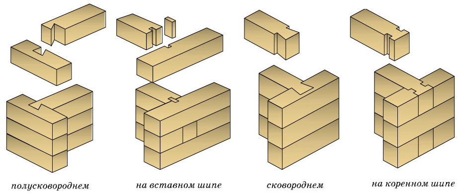 | 9. Эркерные соединения под углом, отличным от прямого | ![]() | Сцепка деталей осуществляется за счет вертикальных пазов и шипов | Ветровая защита низкая, но утеплитель обычно не применяется |