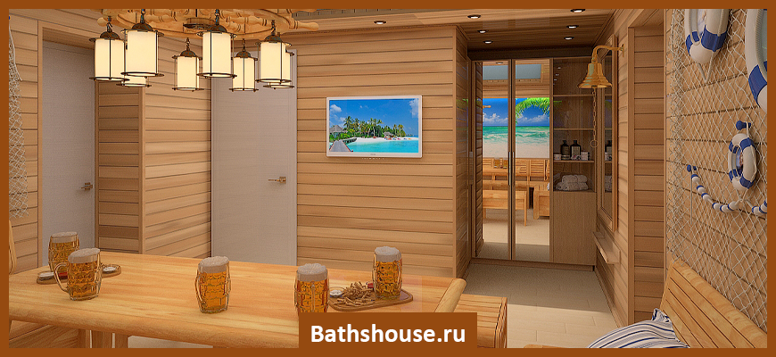 Деревянный брус, из которого сделана баня, наполовину формирует будущий интерьер этой зоны. По сравнению с другими отсеками, в этой зоне застройщик может проявить свою фантазию на 100%. И хотя эта комната подразумевается в единственном экземпляре, зон в ней может быть несколько. Нужно лишь умело соединить все необходимые отсеки, например, бильярд, бар, мягкий уголок, стол для принятия пищи. В такой атмосфере достичь многозональности просто: перегородки и мебель поможет добиться нужного эффекта. Отделочный материал также может стать инструментом для разделения зон в одной комнате.