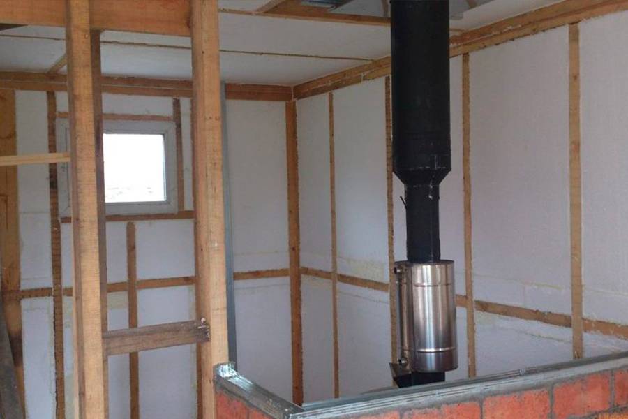 Единственный нюанс при обустройстве потолка – установите в месте выхода дымохода металлический короб 40×40 см. Он потребуется в любом случае, независимо от того, какой печи вы отдадите предпочтение – металлической или кирпичной.