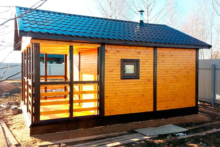 Каркасная баня может быть оборудована террасой для посиделок в теплое время года