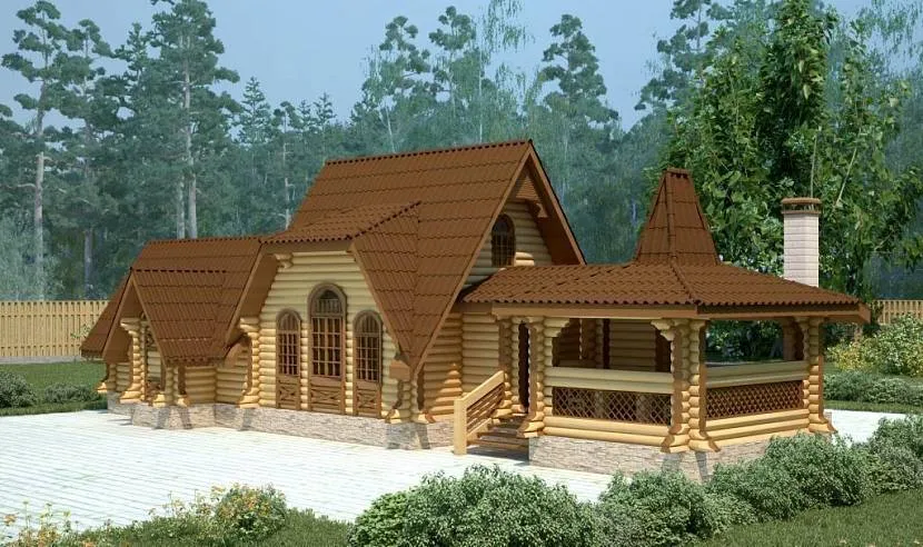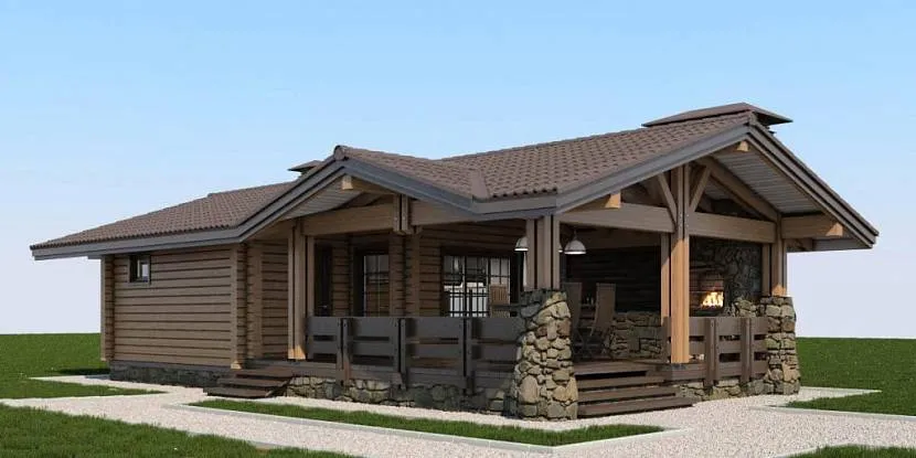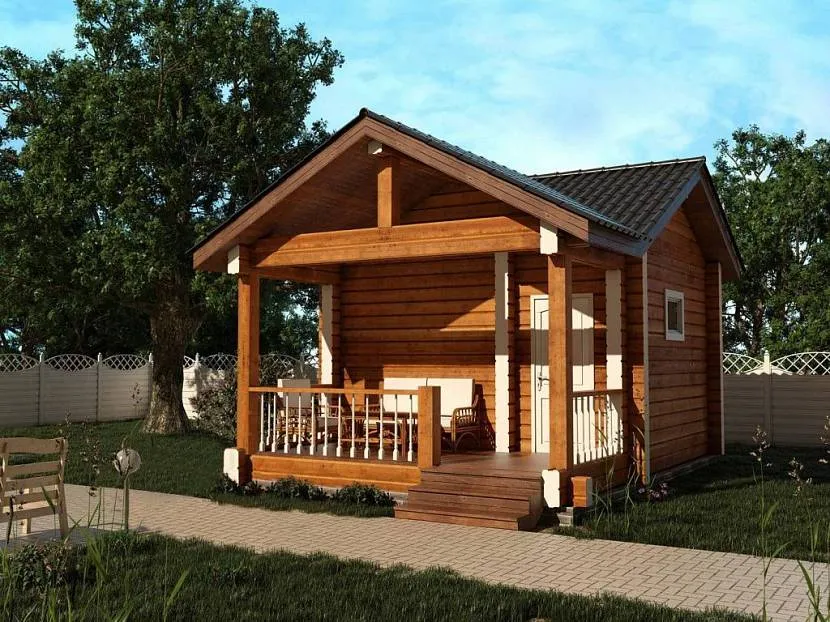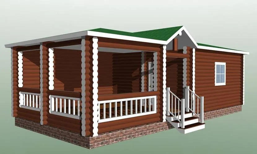 Типовой проект бани из оцилиндрованного бревна: просторная веранда и небольшое крыльцоИсточник nasha-besedka.ru