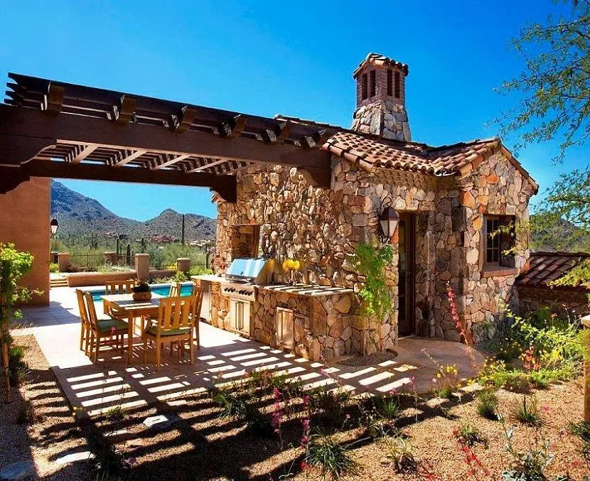 Оригинальная отделка бани искусственным камнем и открытая терраса – вариант для тёплого климатаИсточник banya-ili-sauna.ru
