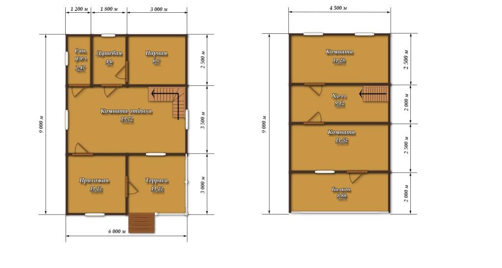 Баня в двух уровнях площадью 54м2: план помещений