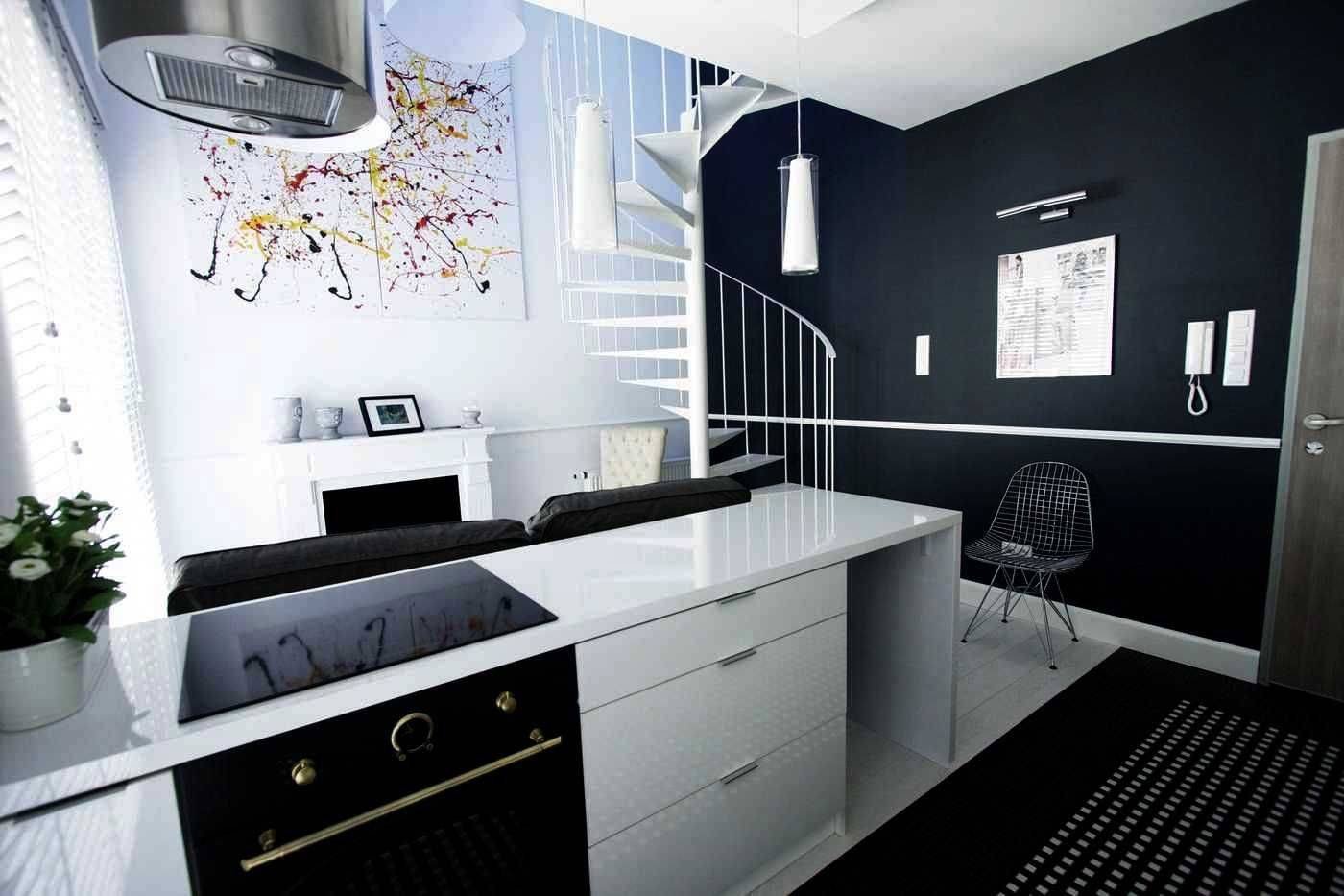 Любая совмещённая комната состоит из двух частей пространства с различным функциональным назначением. Если применить ахроматическую пару в дизайне, можно создать гармоничный интерьер, в котором будут стёрты условные границы, а комната будет выглядеть целостной. Чёрный и белый цвета будут взаимодействовать, и гостиная зона визуально окажется тесно переплетена с кухонной.