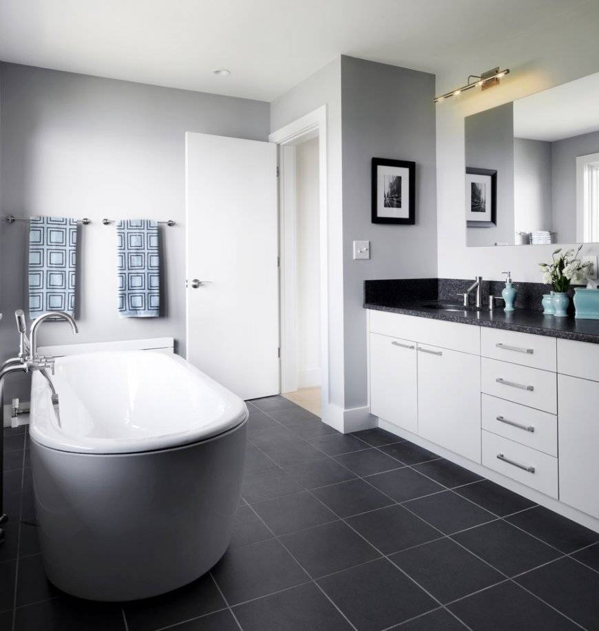 Несмотря на кажущуюся на первый взгляд графичность и строгость, черно-белая ванная комната может быть оформлена плавным сочетанием полутонов. Этого можно добиться, задействовав различные оттенки черного, белого и промежуточного серого в отделке, а также использованием различных принтов.
