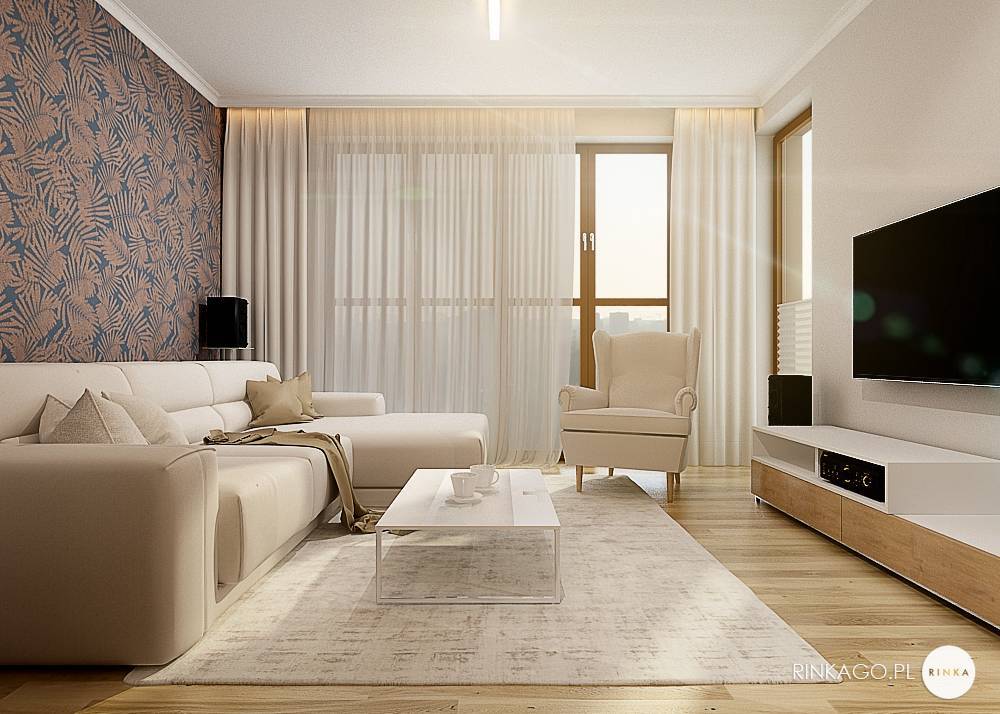 Гостиная с персиковыми стенами, бежевыми занавесками и мягкой мебелью выглядит очень уютно