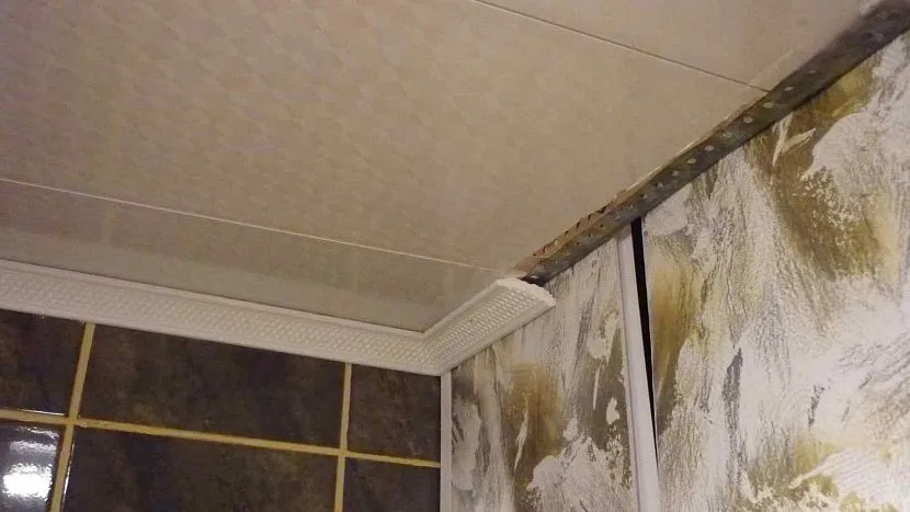 - При монтаже подвесного или натяжного потолка, потолочный плинтус в ванной комнате нужно устанавливать таким образом, чтобы он обеспечивал защиту закрытого потолочного пространства по всему периметру помещения от проникновения водяного пара. В этом случае я рекомендую использовать угловой пластиковый профиль с небольшим отрицательным углом развала боковых полок, которые имеют по краям силиконовые или резиновые гибкие вставки.