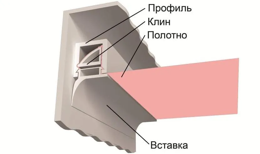 Натяжной потолок представляет собой тонкое полотно из ПВХ-пленки или синтетической ткани. Для крепления материала сооружается каркас из специальных профилей (багетов), которые монтируются по периметру комнаты с отступом в 5-7 см от базового перекрытия. Затем полотно натягивают и заправляют в багеты специальным шпателем. Материал надежно фиксируется, образуя ровную гладкую поверхность.
