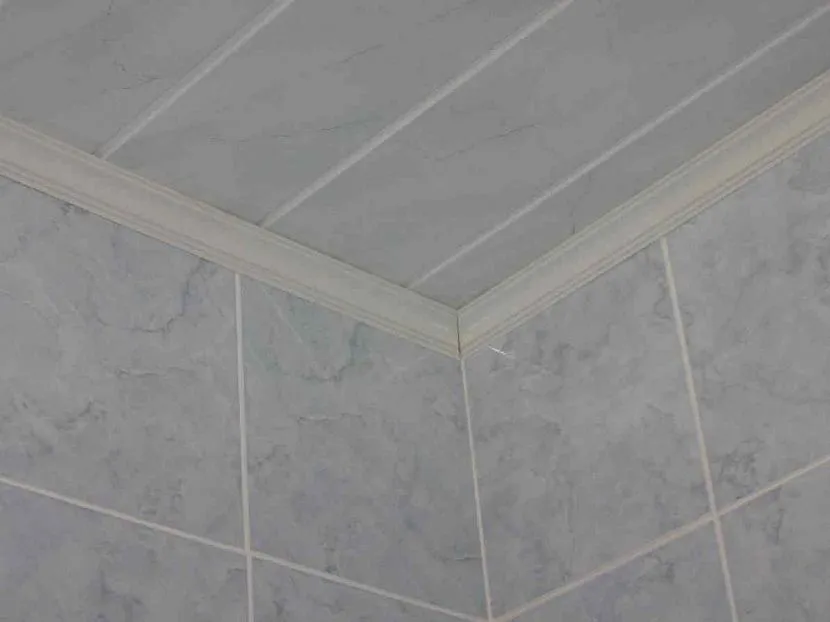 - В тех случаях, когда настенная керамическая плитка или пластиковые панели подходят вплотную к потолку, и нет необходимости устанавливать массивный карниз, я советую использовать узкий профиль из ПВХ с неглубоким пазом шириной 6 или 8 мм, в который плитка или облицовочные панели вставляются еще в процессе монтажа на стену;