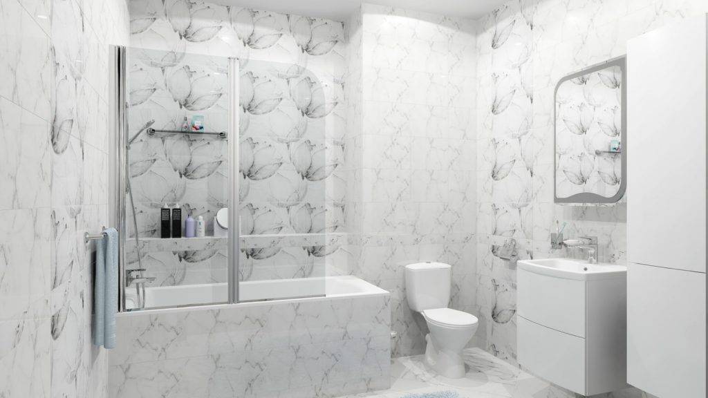 В современных ванных комнатах востребована плитка с рельефным или слегка шероховатым покрытием. Она помогает не поскользнуться на влажном полу.