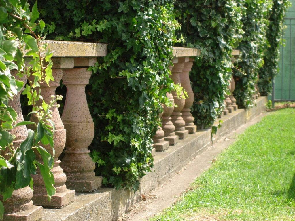 Плющ. Его можно назвать одним из самых лучших вариантов для создания вечнозеленой изгороди. Плющ будет себя довольно комфортно чувствовать как на солнце, так и в тени. Он быстро оплетает стену своей зеленой и густой массой, которая будет создавать на вашем участке прохладу и уют. Относительно ухода плющ является довольно неприхотливым, он может самостоятельно находить опоры благодаря своим присоскам. Ещё один плюс заключается в том, что зелень способна обогащать грунт питательными веществами, что позволяет однолетним лианам быстрее развиваться и лучше цвести.
