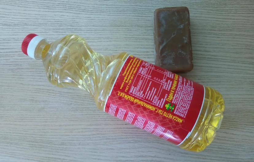 - — растительное масло. Достаточно нанести на загрязнённый участок немного и масла и оставить «настояться» на 10-15 мин. После этого следует протереть влажной салфеткой или губкой.