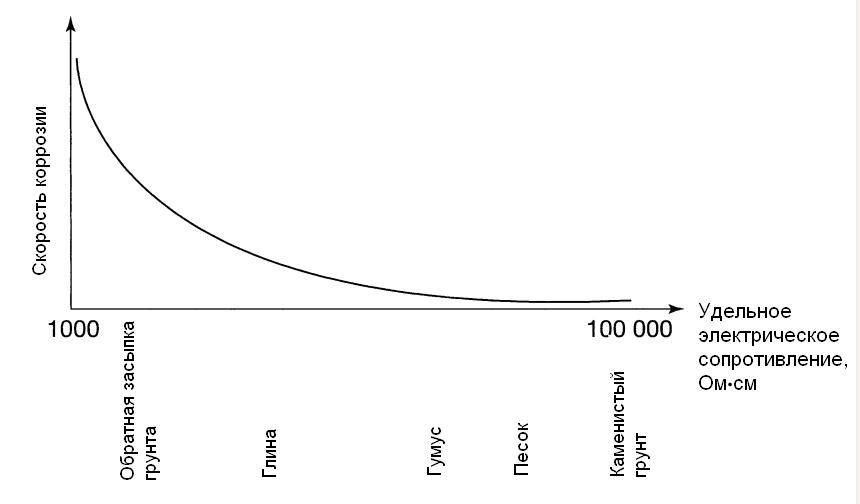 Коррозионная агрессивность почвы связана с ее удельным электрическим сопротивлением, которое зависит не только от состава почвы, но содержания воды и концентрации неорганических солей . На рисунке 3 схематически показана зависимость скорости коррозии алюминия от удельного электрического сопротивления различных видов почв .