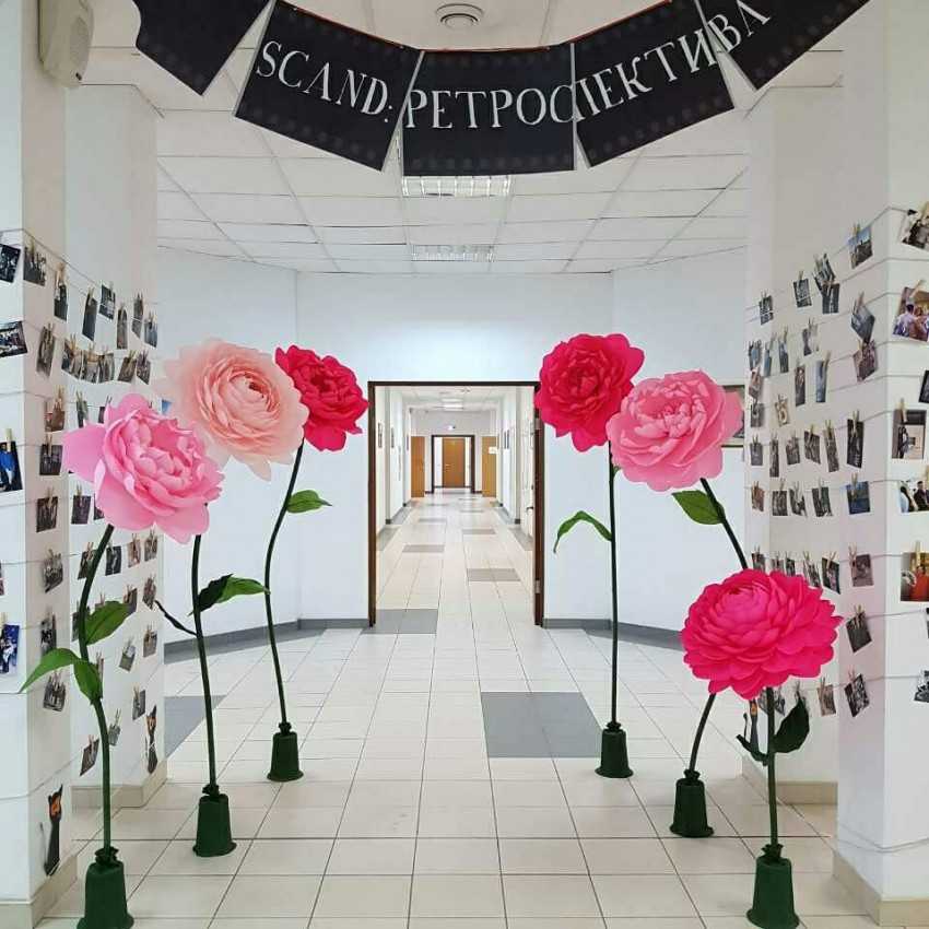 Цветы из бумаги для украшения зала могут отличаться по цветовой гамме, а также по размерам. При желании можно создать пионы, одуванчики, нарциссы, тюльпаны, розы.