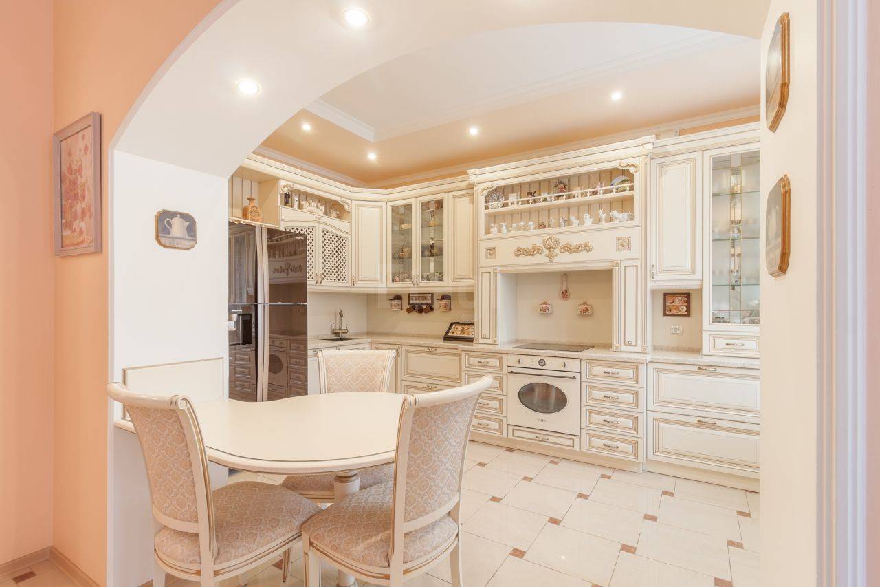 Кухню в античном стиле гармонично дополнит арка с лепниной, оформленная в единой цветовой гамме с кухней. Арочный проем в виде колон, украшенных лепниной, также идеально подойдет для античной кухни.