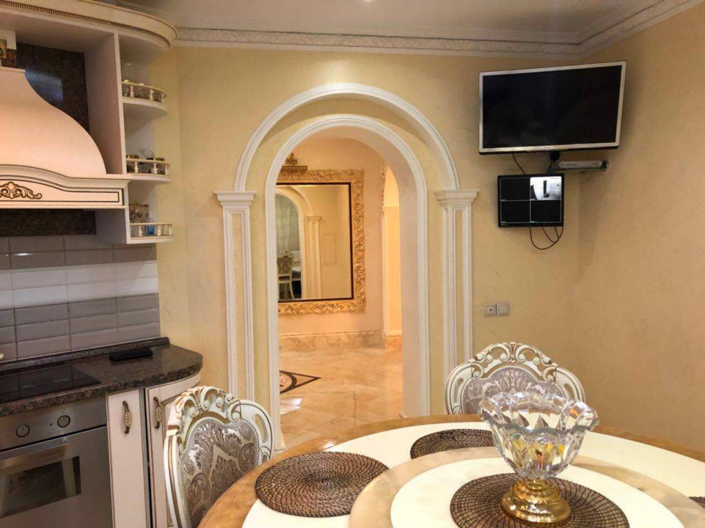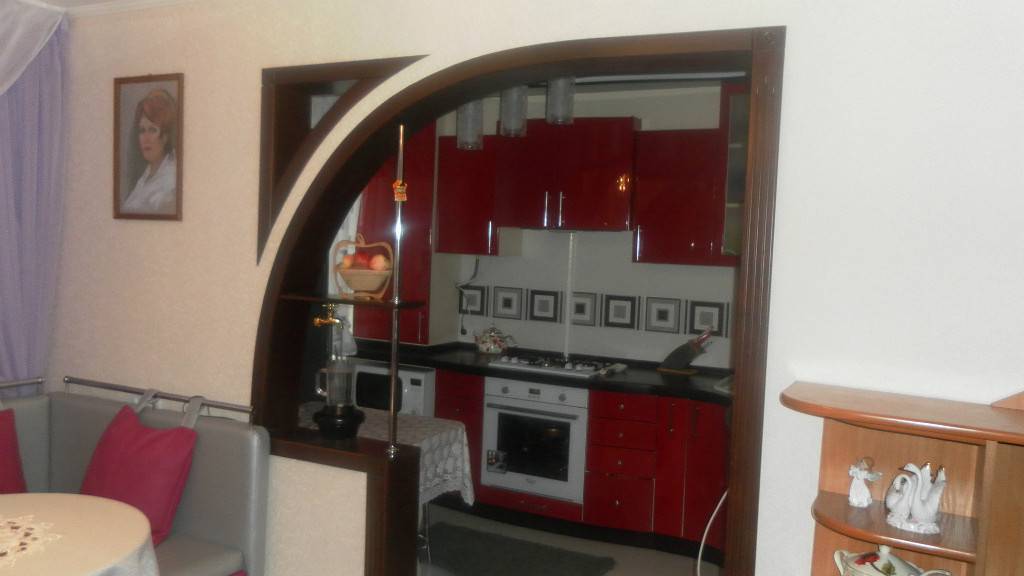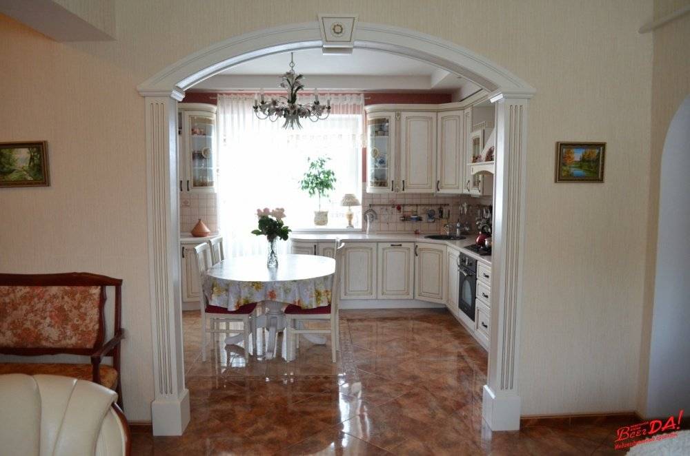 Не следует забывать о декорировании арочных проемов. При установке арки на большой площади можно дополнить ее перегородкой, которая сможет выполнять функцию барной стойки или местом для расположения различных аксессуаров. Такая перегородка гармонично впишется в классический стиль вашей кухни. Чтобы проем соответствовал кухонному интерьеру, рекомендуется декорировать его в одном стиле с кухонной мебелью или столешницей.