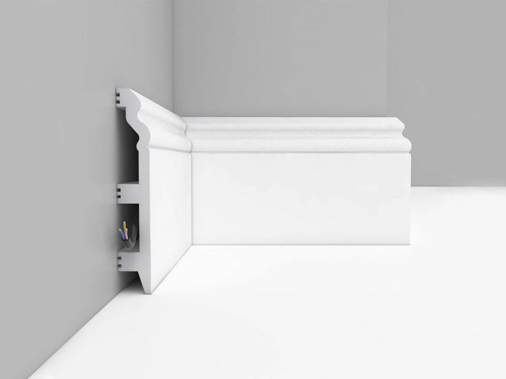 Плинтус для пола полиуретановый обычно представляет собой плоскую планку шириной от 5 до 20 см. Иногда она может иметь фигурный край или орнамент. Плинтус напольный полиуретановый широкий лучше устанавливать в просторных помещениях с высокими потолками – так зрительно пространство не будет искажаться.