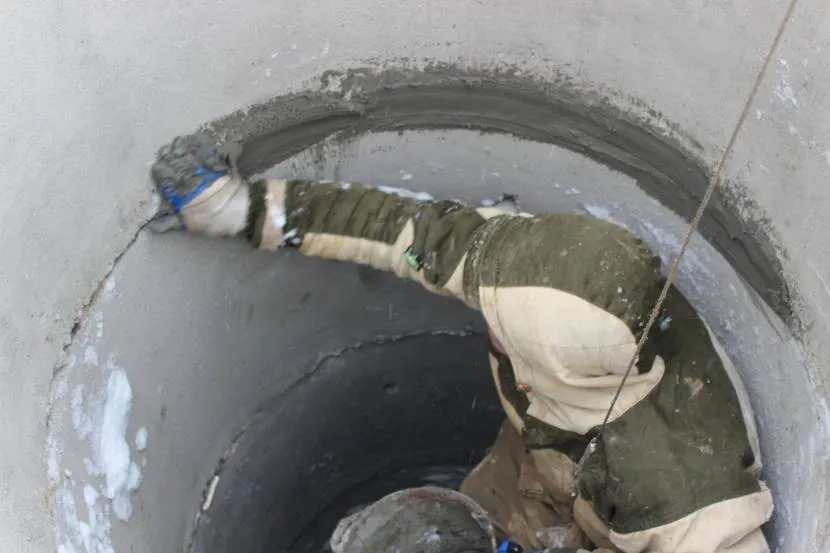 Герметизация колец бетонного колодца. Для этого используется цементный раствор в соотношении 1:3. Бетон должен быть марки 400, песок без посторонних примесей, высокого качества.