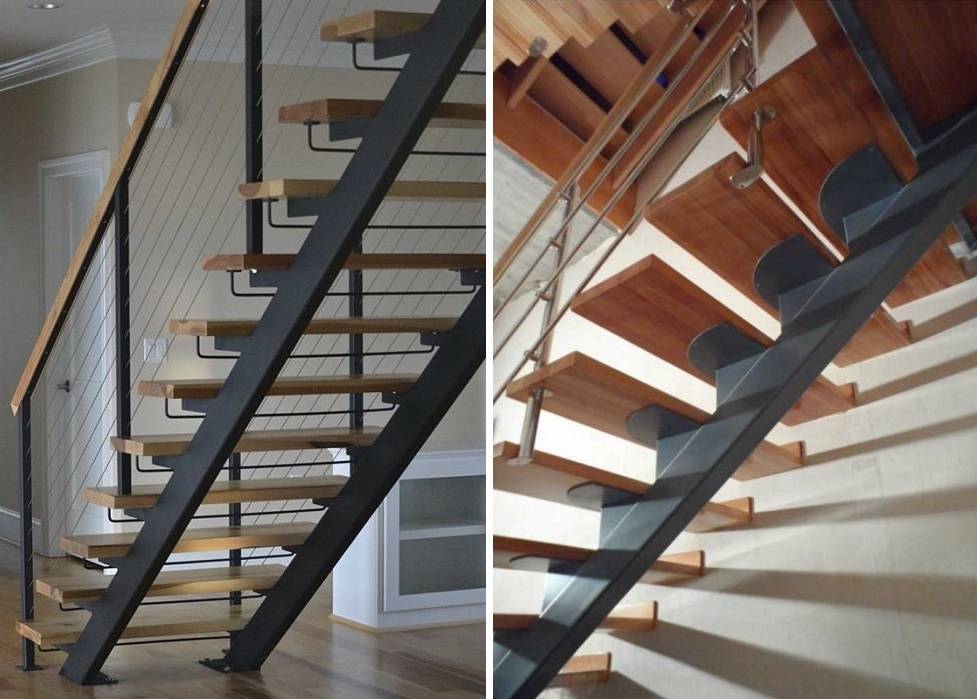 На косоурах. Такие лестницы имеют опоры под каждой ступенью. Вариант является самым распространенным. Существует две разновидности: первая (традиционная) использует два косоура по обоим концам ступеней, во втором случае применяется одна опора, расположенная посередине лестничного марша. К плюсам подобных конструкций относится их надежность, к недостаткам — массивность и большие размеры.