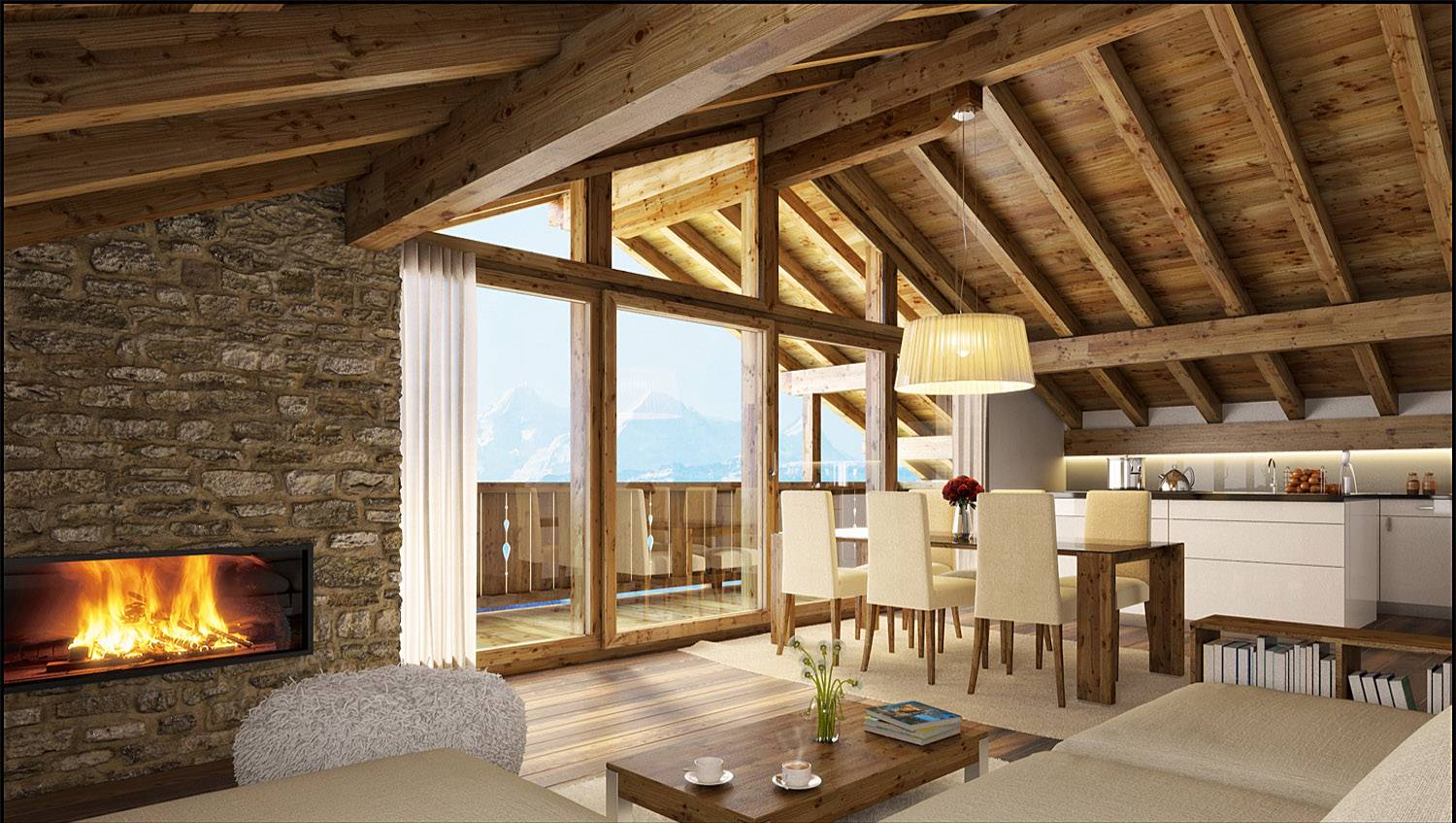Простота интерьера без излишеств, для декора интерьера, выполненного в стиле шале отлично подходит дерево, натуральный камень, шкуры, охотничьи элементы декора и другие различные дизайнерские аксессуары. В центре дома располагается камин, как доминанта в интерьере, отделанный отделкой натуральным камнем. Этот стиль положил свое начало в Альпах, поэтому интерьеры в стиле шале вызывают ассоциации, связанные с домами расположившимися высоко в горах, где надежно защищает семью от любой ненастной непогоды.