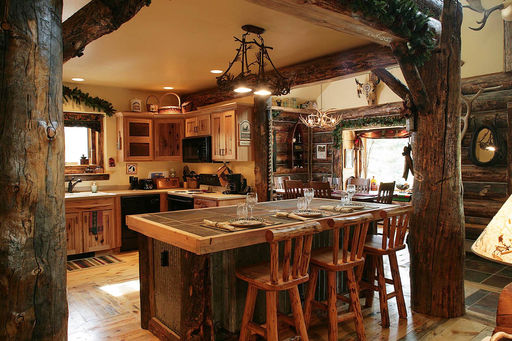 Еще одна кухня в деревянном доме с барной стойкой. Где не только «остров» стоит отдельно, но и рабочая зона размещена в коротком простенке внутренней перегородки.