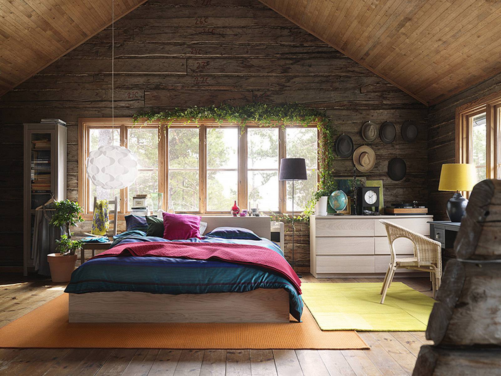 - мансардные окна или скат крыши в спальне добавят уюта и увеличат потолочное пространство;