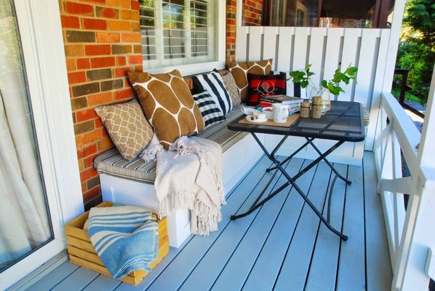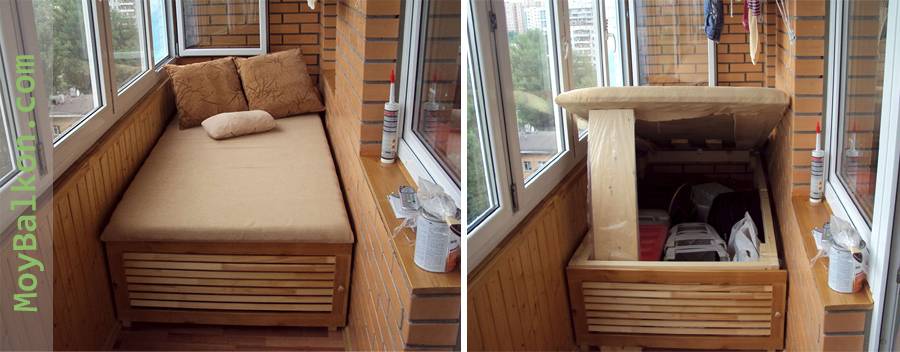 Проще всего оборудовать удобными практичными сидениями торцевую нишу балкона. Обычно делают своими руками двухместный мини-диван или удобный рундук с откидной мягкой крышкой.