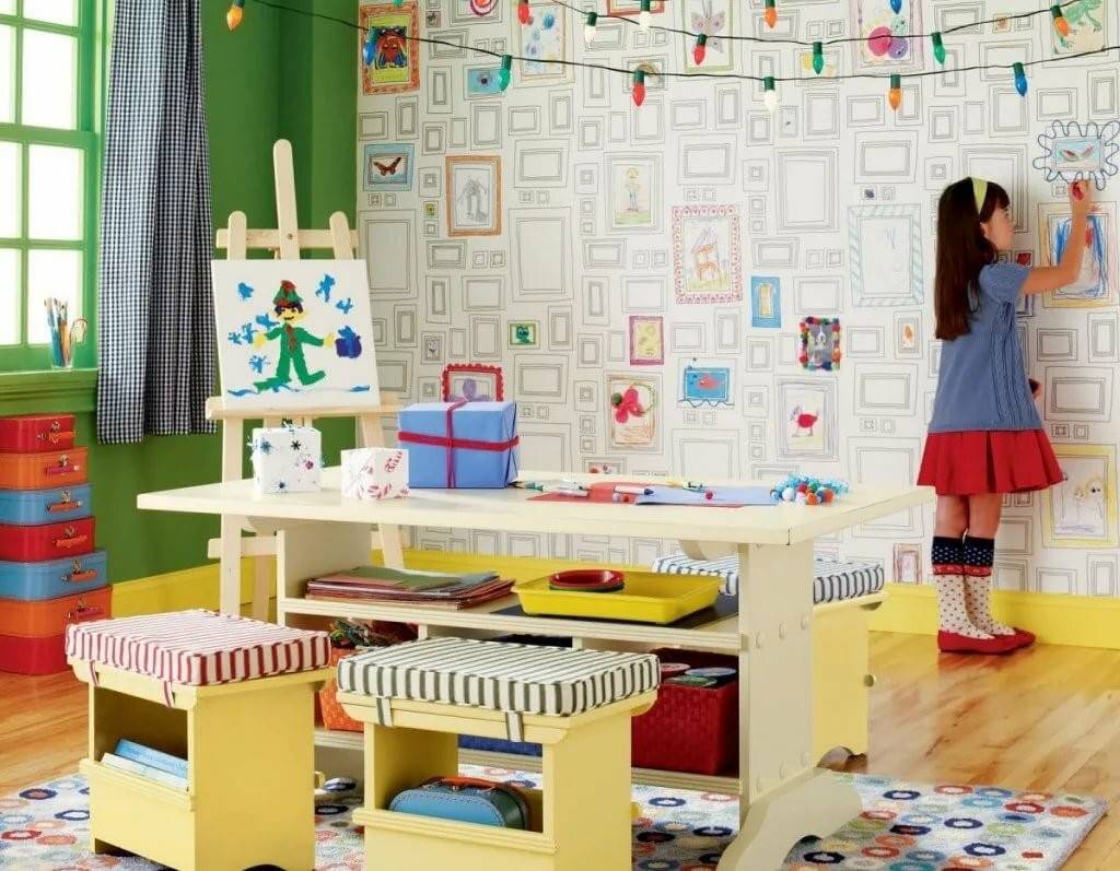 По мере взросления ребенка комната наполняется большим количеством деталей, потому как даже для дошкольника требуется установить стол, за которым он сможет заниматься творчеством. Чтобы сохранить целостность обоев, уместно приобрести небольшой мольберт. Хорошо, когда в комнате для мальчика и девочки будет установлен спортивный комплекс, позволяющий с детства привить детям любовь к спорту.