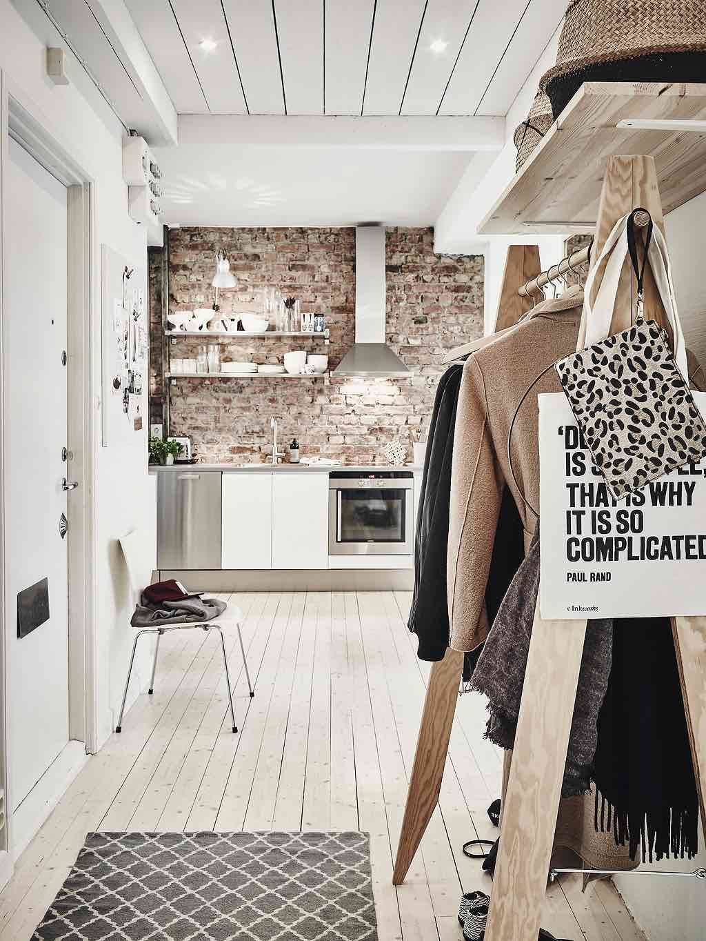 Скандинавский стиль идеально подходит для подобных помещений. Здесь вполне уместна светлая цветовая гамма, которая, тем не менее, допускает сочные яркие цвета. Простые силуэты, решетчатые стеклянные фасады и двери – все играет на пользу крошечной прихожей.