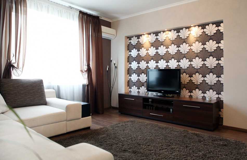 - Если в такой комнате организовано несколько мест для отдыха (например, у окна и напротив телевизора), тогда они могут отделяться визуально рисунком обоев, размещением светильников, непосредственно расстановкой самой мебели.