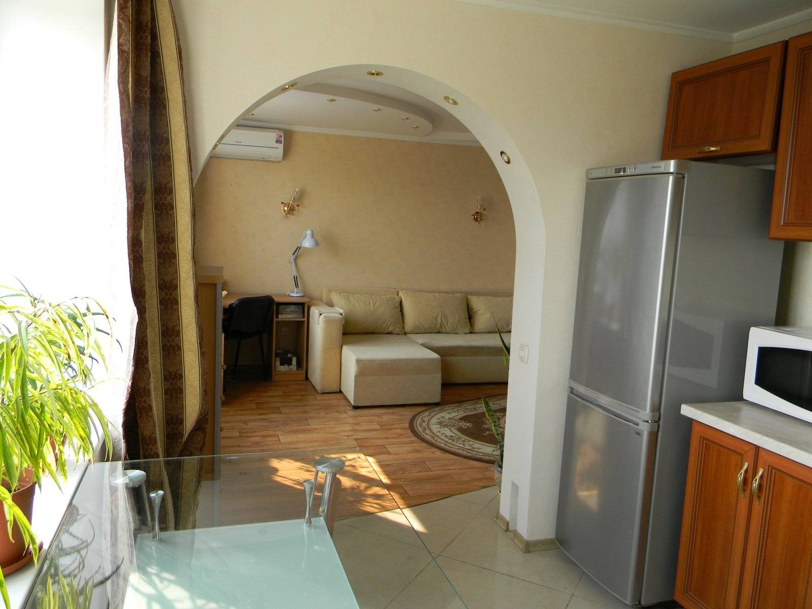 - Совмещение гостиной и кухни 10 кв. м. Для перекрытия подходят арки, барные стойки, ширмы.