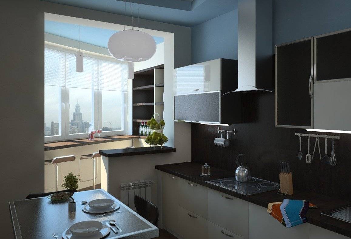 Если у хозяина жилища нет возможности снести стену между балконом и кухней, можно просто демонтировать окно и дверь, соорудив из подоконника барную стойку с откидной столешницей — она с успехом заменит собой обеденный стол и поможет значительно сэкономить место в помещении.