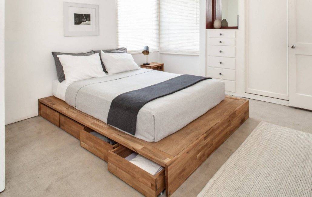 Чтобы спальня не была слишком загроможденной, мебели в комнате должно быть минимальное количество. Помещение будет выглядеть компактнее, если выбрать кровать без ножек. Желательно, чтобы внизу присутствовали выдвижные ящики, где можно хранить вещи.