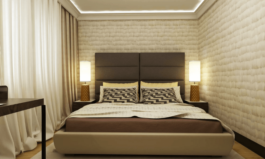 Допускаются акценты в виде картин, изысканных торшеров, керамических фигур, комнатных растений. Постельное белье должно быть шелковым либо хлопковым, без заметных принтов. Точечное светодиодное освещение по периметру и прикроватные бра с матовыми молочно-белыми плафонами помогут создать спокойную атмосферу и настроиться на безмятежный сон.