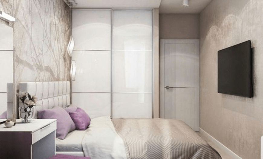 Правильное планирование позволит реализовать стильный дизайн маленькой спальни. Если вам необходимо трюмо, то прекрасной заменой послужит шкаф типа купе. Если его дверь выполнена в зеркальном стиле, то можно смело отказаться от приобретения трюмо.