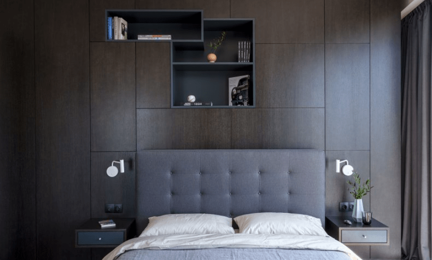 От них лучше отказаться полностью, заменив навесными полками. Будьте осторожны, размещая полки над изголовьем. Дизайн дизайном, а случайно упавший с полки предмет декора может надолго отбить желание думать о красоте интерьера, переключив мысли с эстетичности на здоровье.