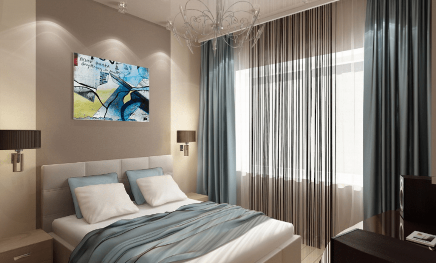 В небольшую спальню лучше выбирать потолочный вариант карниза. Дизайн штор подбирается исходя из общего стиля помещения. Идеальным вариантом станет однотонное полотно без узоров. Наличие рисунка допустимо тогда, когда аналогичный принт отсутствует на обоях. В таком случае все помещение не превратиться в сплошное пятно. Чтобы создать в комнате приятную атмосферу, стоит отдать предпочтение легкому, натуральному текстилю.