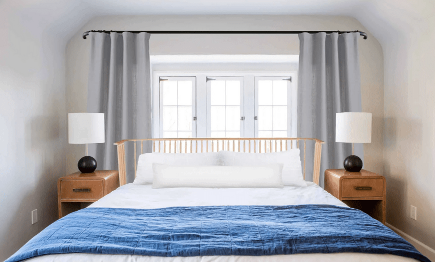 Сделать обычную спальню уютной поможет текстиль и аксессуары. Плотные шторы выбирайте в тон обоев или вовсе замените на прозрачные тюли, откажитесь от рисунка на ткани — декорировать окна лучше однотонными. Вешать их следует от потолка до пола.