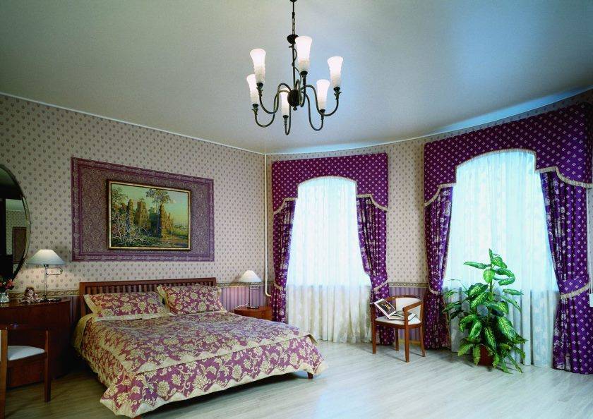 Модерн отличается грациозными элегантными линиями, дополняемыми цветочным принтом. Здесь уместны многоуровневые системы. Востребованы персиковые или лиловые цветы, расположенные на тёмном фоне. На них часто делают акцент.