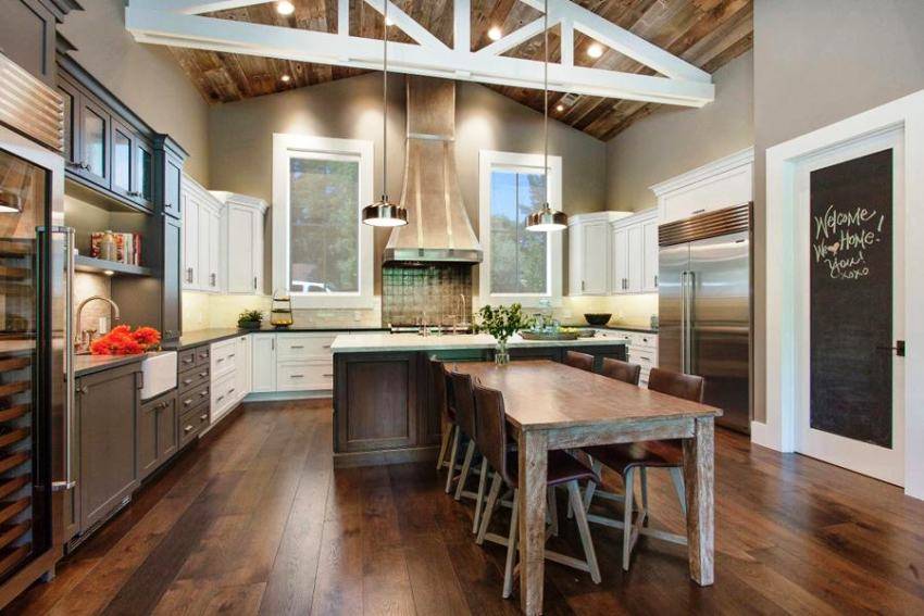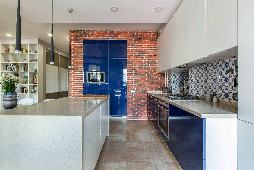 Мебель для кухни, располагающейся в общей комнате, лучше всего покупать на заказ с учетом индивидуальных особенностей помещения. Что касается техники, то рекомендуется приобретать встроенную, которую можно спокойно интегрировать в гарнитур.