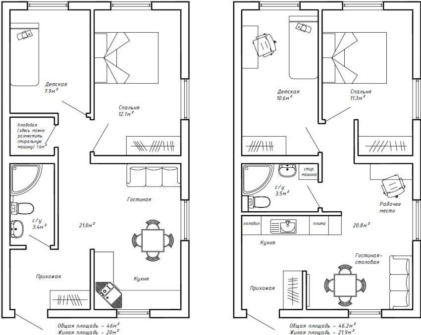 Необходимо учитывать не только текущее расположение комнат, но и анализировать планы. Например, если в скором времени пара планирует завести ребёнка, стоит продумать место под детскую. Пока ребёнка нет, на месте детской можно обустроить кабинет, но сразу учитывать расположение комнат.
