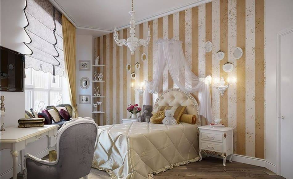 Вертикальные полосы для маленькой спальни, декорированной в английском классическом стиле.