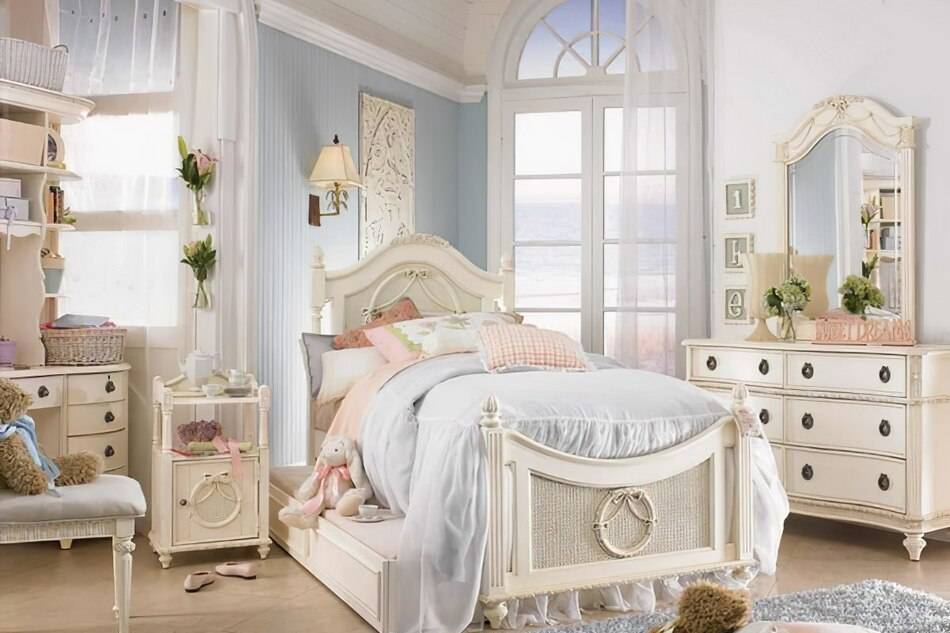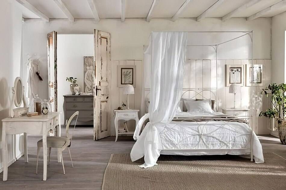 Стили шебби шик и винтаж также можно использовать для оформления небольшой комнаты для сна и отдыха. Потертые поверхности, отреставрированная мебель (или эффектно созданная имитация старины), оригинальный текстиль и скромный декор