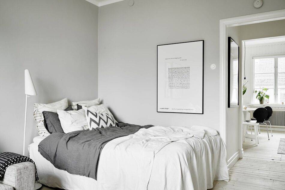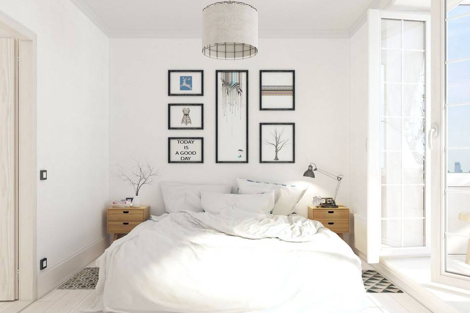 Такой дизайн отлично подойдет для маленькой спальни. Чтобы обыграть комнату, выберите необычное изголовье для кровати или подберите изображения, которые отражают ваши вкусы.
